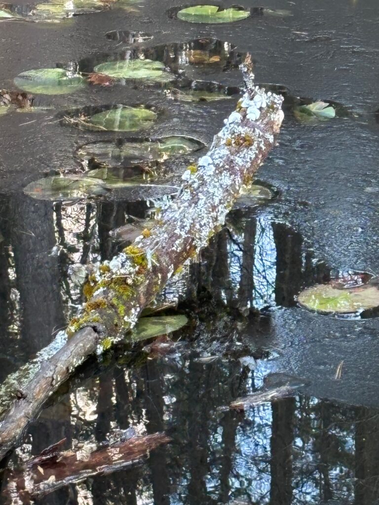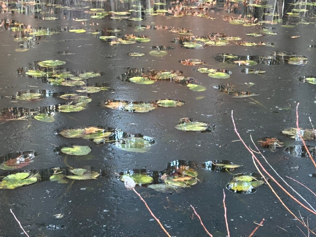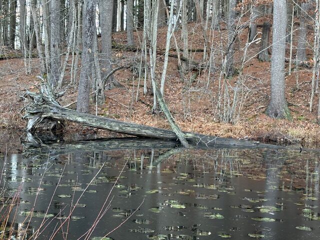 November is here, again, already. I don’t know how that happens. Summer came and went in a flash. Already Lily Pond has a coating of ice. Everything is dry and brown, except for some moss That covers some fallen logs. The pups and I are enjoying a walk on a mid 40s sunny afternoon along the Whitney Brook Trail, our favorite place to walk no matter the season. The beauty of Lily Pond never disappoints and there is still enough open areas around the ice for the pups to get a cold drink of water. We walk all the way to the waterfall at Middle Bridge. We meet no one else on the trail today. The pups have a great time (on leash, of course) with lots of new things to sniff. I am not a fan of colder weather. But it really is a lovely day. The snow will come. I will bring my snowshoes and look for animal tracks, all the while looking forward to seeing the skunk cabbage emerging as the ground begins to thaw again in spring.